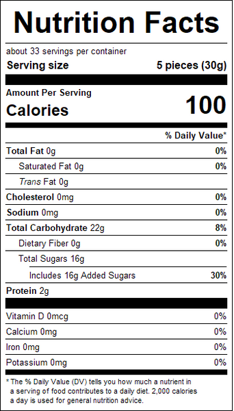 "ingredients": "Glucose Syrup (corn), Sugar, Water, Gelatin, Sorbitol, Citric Acid, Malic Acid, Artificial Flavor, Pectin, Coconut Oil, Carnauba Wax, Artificial Color: Titanium Dioxide (clor), Caramel, FD&C Yellow #5, FD&C Yellow #6, FD&C Red #40.May contain milk.",