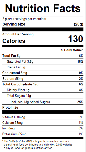 "ingredients": "Sugar, Almonds, Cocoa Butter, Milk, Chocolate Liquor, Corn Syrup, Salted Butter, Salt, Cashews, Soy Lecithin (An Emulsifier), Vanilla, Sodium Bicarbonate (Leavening), Hydrogenated Palm Kernel Oil.<br /><br />Contains, Milk, Soy, Almonds, Cashews<br /><br />Allergy Information: Shares Equipment With Products Containing Peanuts, Egg, Wheat And Other Tree Nuts.<br /><br />Made with Bioengineered Ingredient(s).",
