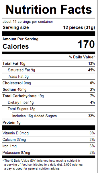 "ingredients": "Alpine Milk Wafer (sugar, vegetable oil [palm kernel oil and hydrogenated palm kernel oil], cocoa powder, nonfat dry milk, whole milk powder, whey powder, soy lecithin [an emulsifier], salt, artificial flavor).<br />Contains Milk, Soy.<br />Processed on equipment that also processes: Crustacean Shellfish, Egg, Fish, Milk, Peanut, Sesame, Soy, Tree Nuts (Almond, Brazil Nut, Cashew, Coconut, Filbert (Hazelnut), Macadamia Nut, Pecan, Pine Nut, Pistachio, Walnut) and Wheat.",
