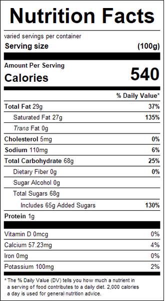 "ingredients": "Sugar, Vegetable Oil (Palm Kernel Oil And Hydrogenated Palm Kernel Oil), Whey Powder, Whole Milk Solids, Nonfat Dry Milk Solids, Soy Lecithin (An Emulsifier), Salt, And Artificial Flavor. Allergens: Milk And Soy.",