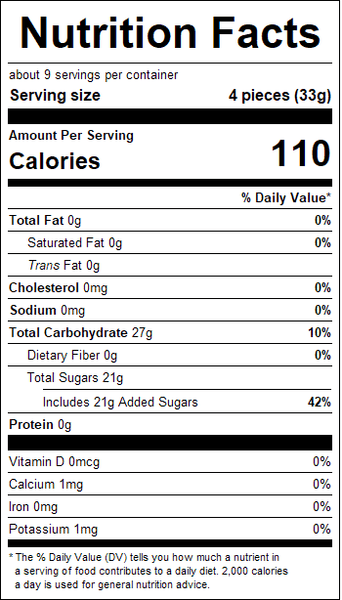 "ingredients": "Assorted JuJu Fish (corn syrup, sugar, cornstarch, modified cornstarch, and less than 2% of the following : natural and artificial flavors, carnauba wax, yellow 6, red 40, yellow 5, blue1.).<br />Processed on equipment that also processes: Crustacean Shellfish, Egg, Fish, Milk, Peanut, Sesame, Soy, Tree Nuts (Almond, Brazil Nut, Cashew, Coconut, Filbert (Hazelnut), Macadamia Nut, Pecan, Pine Nut, Pistachio, Walnut) and Wheat.<br /><br />Made with Bioengineered Ingredient(s).",