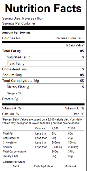 "ingredients": "Sugar, Corn Syrup, Dextrose, Glycerin, Beef Gelatin, Vegetables Gums (tragacanth, arabic and xanthan), Natural and Artificial Flavor, Blue 2, Red 40 Lake, Red 3, Blue 2 Lake, Blue 1 Lake, Yellow 5 Lake.",