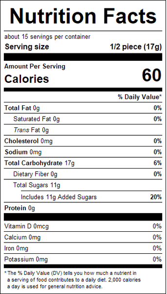 "ingredients": "Sugar, Corn Syrup, Citric Acid, Natural & Artificial Flavors, Yellow 5, Red 40, Red 3, Blue 1.",