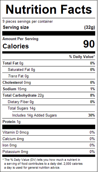 "ingredients": "Corn Syrup (From Corn), Sugar (From Beets), Water, Gelatin, Citric Acid, Artificial Flavor, Pectin (Derived From Fruit), Vegetable Oil (Coconut, Canola) And Carnauba Leaf Wax (To Prevent Sticking), Fd&C Blue #1<br /><br />* Blue #1 - E133<br />**Coconut Oil Is Highly Refined And Is Not Considered An Allergen.<br /><br />Product Is Free Of The Top 8 Allergens: Milk, Soy, Wheat, Egg, Peanuts, Tree Nuts, Fish, And Shellfish",
