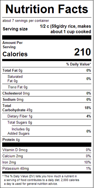 "ingredients": "Enriched Precooked Parboiled Long Grain Rice (rice, niacin, iron [ferric orthophosphate], thiamin [thiamin mononitrate], folic acid).",
