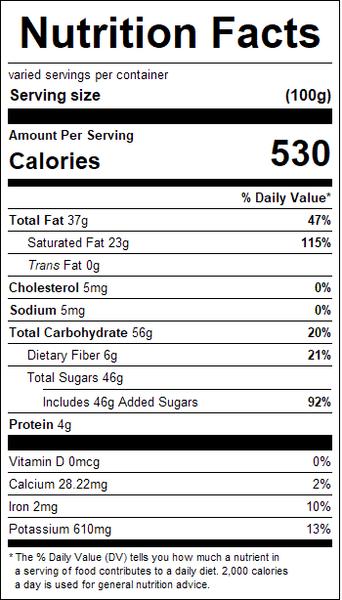 "ingredients": "Semisweet Chocolate (Sugar, Chocolate Liquor Processed With Alkali, Cocoa Butter, Milk Fat, Soy Lecithin-An Emulsifier, Vanillin - An Artificial Flavor, Natural Flavors).<br /><br />Contains: Milk And Soy Ingredients.",