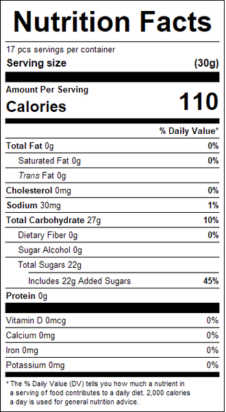 "ingredients": "Sugar, Corn Syrup, Contains Less Than 2% Of The FollowSalt, Glycerine, Egg Whites, confectioner's Glaze, Natural And Artificial Flavors, Mineral Oil, Honey, Carnauba Wax, Vegetable Oil (Coconut And Canola Oil), Artificial Colors (Includes Fd&C: Yellow #6, Yellow #5, Red #40 And Blue #1). <br /><br />Allergens: Contains Egg. Manufactured In A Facility That Processes Products Containing Soy, Milk, Wheat, Peanut And Tree Nut (Almonds, Pecans And Brazil Nuts) Ingredients.",