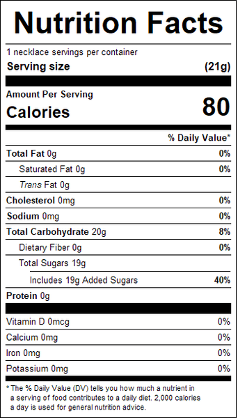 Kids will love to accessorize their outfits with this tasty necklace! Each candy piece is full of fruit flavor and is beaded on an elastic string, making each necklace easy to slip over your head. Choose to bite off one piece at a time or munch on a mouthful. No matter how you to eat it, you're sure to love the sweet fruit flavor in each candy bead!