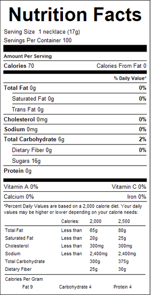 Kids will love to accessorize their outfits with this tasty necklace! Each candy piece is full of fruit flavor and is beaded on an elastic string, making each necklace easy to slip over your head. Choose to bite off one piece at a time or munch on a mouthful. No matter how you to eat it, you're sure to love the sweet fruit flavor in each candy bead!