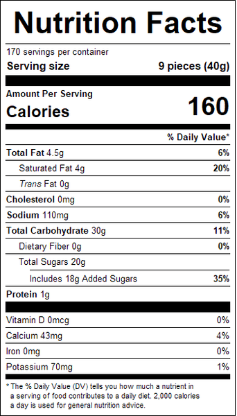 "ingredients": "Cane Sugar, Corn Syrup, Coconut Oil, Nonfat Dry Milk, Whey, Salt, Citric Acid, Sunflower Lecithin, Sodium Bicarbonate, and Natural Apple Flavors.Contains milk.Manufactured in a facility that processes peanuts and uses milk, egg, and tree nuts.",
