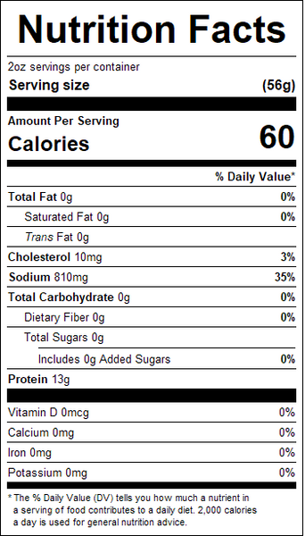 "ingredients": "Beef, Water, Salt, Sugar, Autolyzed Yeast Extract, Sodium Erythorbate, Sodium Nitrite",