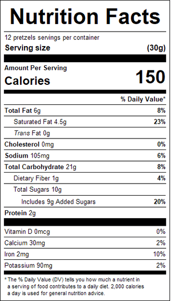 "ingredients": "Chocolate Flavored Confectonery Coatng [Sugar, Palm Kernel And/Or Palm Oil, Cocoa Powder, Whey Powder, Nonfat Dry Milk, Soy Lecithin, Natural Vanilla Extract], Pretzels [Unbleached Enriched Wheat Flour (Flour, Niacin, Reduced Iron, Thiamine Mononitrate-B1, Ribofavin-B2, Folic Acid), Malt, Salt, Soybean And/Or Canola Oil, And Yeast].<br /><br />Contains: Milk, Wheat, And Soy Ingredients. <br /><br />May Contain Traces Of Peanuts And Tree Nuts.",