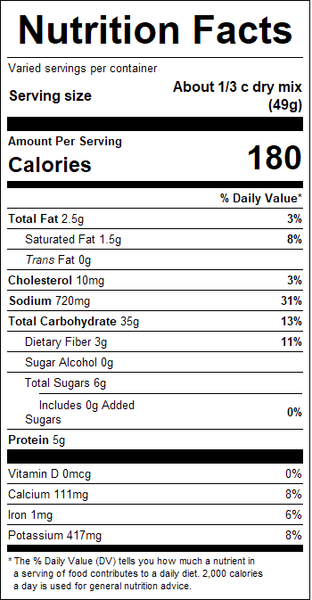 Chunky Potato Soup Starter is a delicious and nutritious alternative to common potato soups. This mix features a variety of garden vegetables in a base made with real whole milk, sweet cream buttermilk and potatoes. This potato soup has neither meat nor meat broth added which makes it perfect for those on a meatless diet. Try adding browned, ground beef or drained canned tuna to make a one-pot meal.