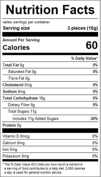 "ingredients": "Sugar, Corn Syrup, and less than 2% of the following: Natural and Artificial Flavor, Red 40, Blue 1.<br /><br />Made with Bioengineered Ingredient(s).",