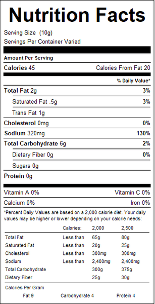 "ingredients": "Shortening Powder (palm oil, corn syrup solids, sodium caseinate, dipotassium phosphate, monoglycerides), Wheat Flour, Modified Corn Starch, Maltodextrin, Salt, Monosodium Glutamate, Caramel Color, Onion Powder, Spice, Hydrolyzed Soy and Corn Protein, Natural Flavor, Yeast Extract, Chicken Fat, Natural Turmeric Extract, Disodium Guanylate and Inosinate. Allergens: Milk, Soy, and Wheat.",