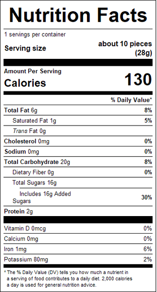 "ingredients": "Sugar, Cashews, Crystallized Orange (citric acid, orange oil, orange juice), Sugar, Artificial Flavor.Contains cashew.",