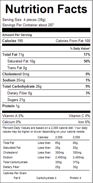 "ingredients": "Sugar, Hydrogenated Vegetable Oil (Palm Kernel And/Or Palm), Whey, Lactose, Crisp Rice (Rice, Sugar, Salt, Barley Malt), Cocoa (Processed With Alkali), Skim Milk, Soy Lecithin (Emulsifier), Vanillin (Artificial Flavor). <br /><br />Manufactured On Equipment Which Processes Wheat, Peanut Butter And Almonds.",
