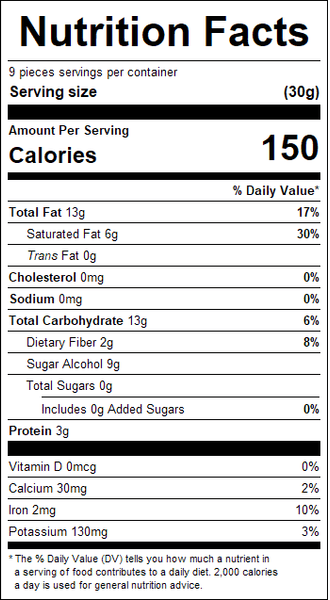 "ingredients": "Chocolate Coating (Maltitol, Chocolate Liquor, Cocoa Butter, Milk Fat, Soy Lecithin [An Emulsifier], Vanilla), Almonds, Water, Gum Arabic, Confectioners Glaze, Modified Starch (Tapioca), Vegetable Oil (Coconut Oil, Canola Oil).<br /><br />Contains Milk, Soy, Tree Nuts (Almonds).<br /><br />Manufactured In A Plant That Processes Peanuts, Tree Nuts, Soy, Wheat (Gluten), Eggs And Dairy Products.",