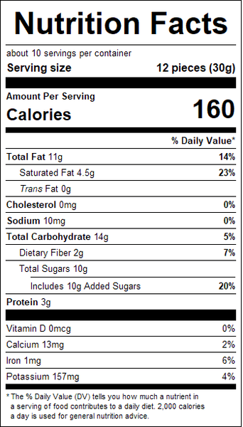 "ingredients": "Dark Chocolate Peanuts (dark chocolate (sugar, chocolate liquor, cocoa butter, chocolate liquor processed with alkali, butterfat, soy lecithin [an emulsifier], natural vanilla flavor, salt), peanuts, water, gum arabic, confectioners glaze, modified starch (tapioca), coconut oil, canola oil).<br />Contains Milk, Peanut, Soy.<br />Processed on equipment that also processes: Crustacean Shellfish, Egg, Fish, Milk, Peanut, Sesame, Soy, Tree Nuts (Almond, Brazil Nut, Cashew, Coconut, Filbert (Hazelnut), Macadamia Nut, Pecan, Pine Nut, Pistachio, Walnut) and Wheat.",
