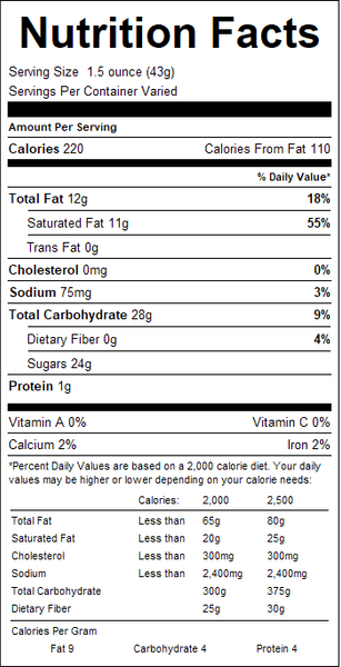 "ingredients": "Sugar, Hydrogenated Vegetable Oil (Palm Kernel And/Or Palm), Whey, Lactose, Crisp Rice (Rice, Sugar, Salt, Barley Malt), Cocoa (Processed With Alkali), Skim Milk, Soy Lecithin (Emulsifier), Vanillin (Artificial Flavor). Contains: Milk And Soy. Manufactured On Equipment Which Processes Wheat, Peanut Butter, And Almonds.",