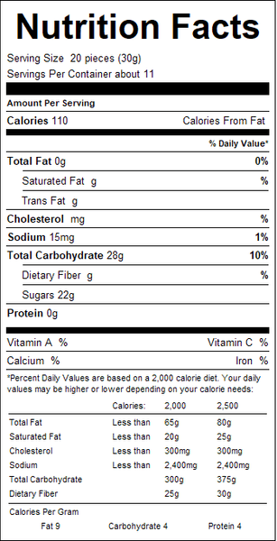"ingredients": "Sugar, Glucose Syrup, Modified Cornstarch, Apple Juice Concentrate, Fumaric Acid, Artificial Flavors, Citric Acid, Confectioner's Glaze (shellac), Mineral Oil, Coconut Oil, Beeswax, Artificial Colors 9titanium dioxide, yellow 5, yellow 6, red 40, Carnauba Wax.Manufactured in a facility that processes peanuts, tree nuts, milk, soy and wheat.",