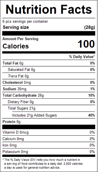"ingredients": "Sugar, Corn Syrup, Contains Less Than 2% Of The Followconfectioner's Glaze, Salt, Honey, Egg Whites, Natural And Artificial Flavors, Mineral Oil, Coconut Oil, Carnauba Wax, Artificial Colors (Including Fd&C Yellow 5, Blue 1, And Red 3). <br />Contains: Egg Ingredients. <br />Manufactured In A Facility That Processes Products Containing Soy, Milk, Wheat, Peanut And Tree Nut (Almonds, Pecans And Brazil Nuts) Ingredients.<br /><br />Made with Bioengineered Ingredient(s).",