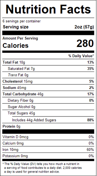 "ingredients": "Sugar, Cream, Butter, Palm Oil, Corn Syrup Solids, Brown Sugar, Potassium Sorbate (prevents mold), Salt, Spices, Natural Flavors.Contains milk.Processed on shared equipment used to process peanuts, tree nuts, milk, soy, sulfites and wheat.",