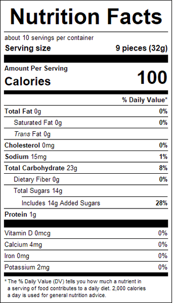 "ingredients": "Freedom Gummi Bears (corn syrup, sugar, water, gelatin, citric acid, artificial flavor, pectin, vegetable oil [coconut, canola] and carnauba leaf wax [to prevent sticking], FD&C red #40, FD&C blue #1, titanium dioxide [color]).<br />Processed on equipment that also processes: Crustacean Shellfish, Egg, Fish, Milk, Peanut, Sesame, Soy, Tree Nuts (Almond, Brazil Nut, Cashew, Coconut, Filbert (Hazelnut), Macadamia Nut, Pecan, Pine Nut, Pistachio, Walnut) and Wheat.",