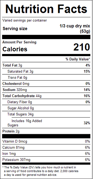 "recipe": "Mixing Instructions:<br /><br />Use ⅓ cup mix per<br />8 oz. of hot water.<br />Mix well and enjoy.",