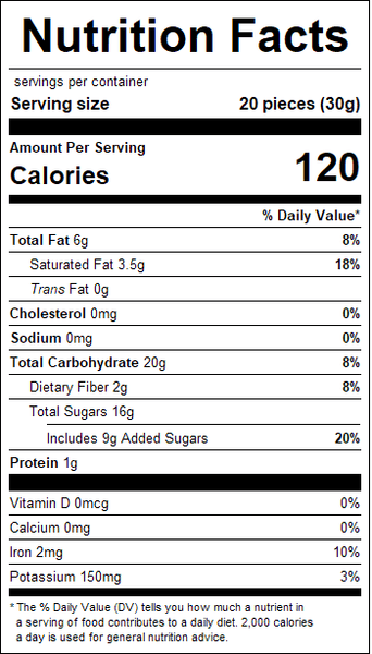 Dark Chocolate Raisins 15lb feature plump, chewy raisins coated in a smooth, rich dark-chocolate layer for a consistent, high-quality product suitable for repacking, foodservice, and manufacturing applications. The combination of sweet raisins and balanced dark-chocolate bitterness makes this item ideal for bulk bins, snack mixes, bakery toppings, and specialty confection programs.