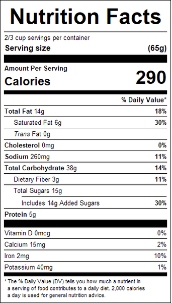 "ingredients": "Rolled Oats, Light Brown Sugar (Sugar, Molasses, Caramel Color), Rolled Wheat, Margarine (soybean oil, hydrogenated soybean oil, water, mono and diglycerides, soy lecithin, sodium benzoate (preservative), artificial flavor, beta carotene (color), vitamin a palmitate), Unsweetened Coconut, Whole Wheat Flour, Walnuts, Baking Soda, Salt, Natural and Artificial Flavor.Contains: Wheat, Milk, Tree Nut (Coconut, Walnuts).<br /><br />Made with Bioengineered Ingredient(s).",