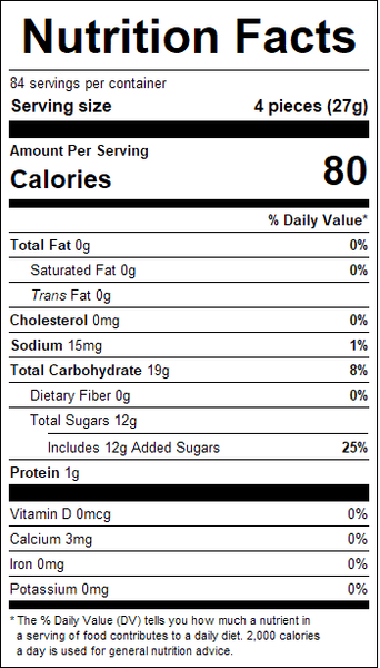 "ingredients": "Corn Syrup, Sugar, Water, Gelatin, Citric Acid, Natural and Artificial Flavors, Pectin, Vegetable Oil (coconut, canola) And Carnauba Leaf Wax (to prevent sticking), FD&C Red #40, FD&C Yellow #5, FD&C Yellow #6, FD&C Blue #1.",