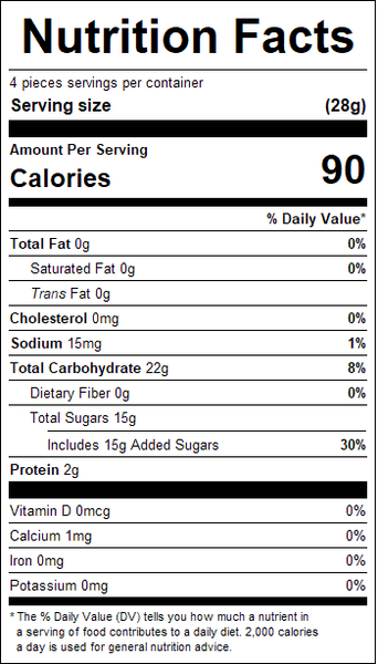 "ingredients": "Corn Syrup, Sugar, Gelatine, Modified Potato Starch; Acids: Citric Acid; Natural And Artificial Flavor; Glazing Agent: Beeswax, Carnauba Wax; Vegetable Oil (Palm And Palm Kernel Oils), Color: Caramel.",