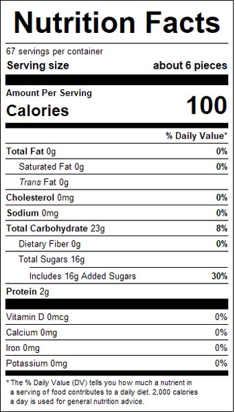"ingredients": "Glucose Syrup, Sugar, Pork Gelatin, Acidifier (citric acid), Coloring (turmer-natuarl, carmine-natural, FD&C Blue #1-artificial), Natural Flavorings (apple, lemon, raspberry, pear, orange), Vegetable Oil (coconut, Glazing Agent (carnauba wax).",