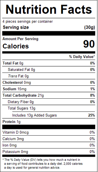"ingredients": "Corn Syrup (From Corn), Sugar (From Beets), Water, Gelatin, Citric Acid, Artificial Flavor, Pectin (Derived From Fruits), Vegetable Oil (Coconut, Canola) And Carnauba Leaf Wax (To Prevent Sticking), Fd&C Blue #1, Titanium Dioxide (Color), Fd&C Red #40. <br /><br />**Coconut Oil Is Highly Refined And Is Not Considered An Allergen.<br /><br />Product Is Free Of The Top 8 Allergens: Milk, Soy, Wheat, Egg, Peanuts, Tree Nuts, Fish, And Shellfish",