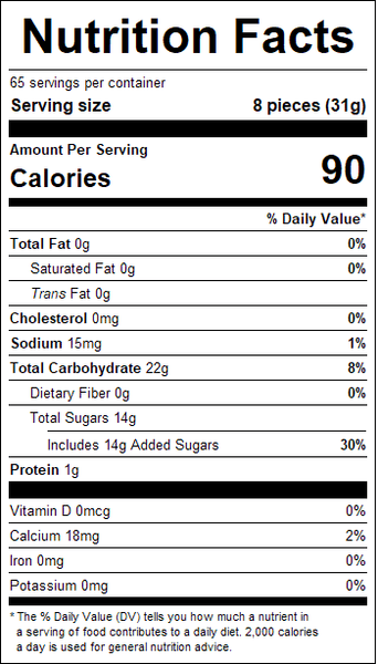 "ingredients": "Corn Syrup, Sugar, Water, Gelatin, Citric Acid, Artificial Flavor, Lactic Acid, Pectin, Titanium Dioxide (color), FD&C Yellow #5, FD&C Red #40, FD&C Blue #1.",
