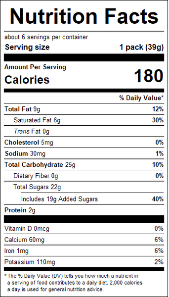 "ingredients": "Milk Chocolate (sugar, chocolate, milk, cocoa butter, skim milk, milk fat, lecithin [soy], PGPR, natural flavor), Corn Syrup, Vegetable Oil (palm oil, palm kernel oil), Invert Sugar, contains 2% or less of: Skim Milk, Natural & Artificial Flavor, Artificial Color, Salt, Baking Soda.Contains milk, soy.",
