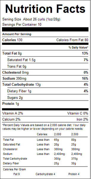 These light and crunchy cheese curls are full of cheddar flavor and have been coated with a special blend of seasonings to turn them into a spicy treat.