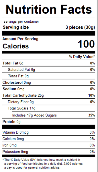 "ingredients": "Sugar, Corn Syrup, Modified Food Starch, Natural and Artificial Colors (including FD&C: red 40, yellow 6 lake, red 40 lake, yellow 5, yellow 6, blue 1 lake, blue 1, yellow 5 lake).Manufactured in a facility that processes products containing egg, soy, milk, wheat, peanut an tree nut (almonds, pecans and brazil nuts) Ingredients.",