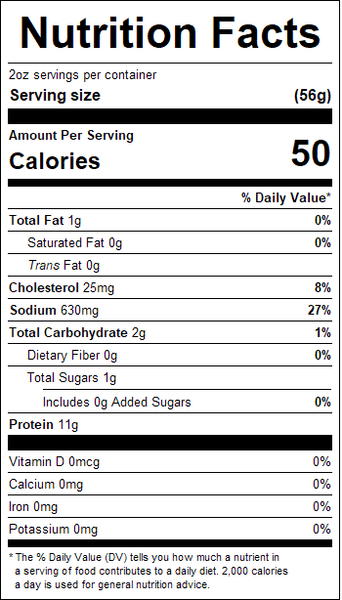"ingredients": "Chicken Breast Meat, Water, Buffalo Style Seasoning (Salt, Sugar, Spices, Garlic Powder, Onion Powder, Sodium Diacetate, Paprika, Citric Acid, Natural Flavors, Soybean Oil), Salt, Dextrose, Sodium Phosphates.",