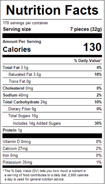 "ingredients": "Corn Syrup, Cane Sugar, Coconut, Non Fat Dry Milk, Sorbitol, Coconut Oil, Dextrose, Salt, Mono and Diglycerides, Sunflower Lecithin, Natural and Artificial Flavor.Contains milk, coconut.Manufactured in a facility that processes peanuts and uses milk and tree nuts.",