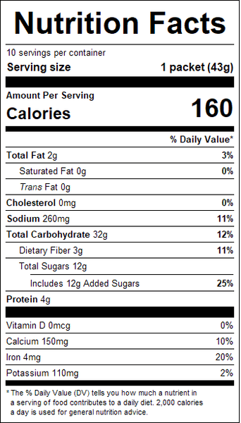 "ingredients": "Whole Grain Rolled Oats, Sugar, Contains Less Than 2% of Salt, Guar Gum, Natural Flavor, Caramel Color, Calcium Carbonate (a source of calcium), Ferric Orthophosphate (a source of iron), Vitamin A Palmitate, Niacinamide*, Pyridoxine Hydrochloride*, Riboflavin*, Thiamine Mononitrate*, Folic Acid*.*one of the B vitamins",