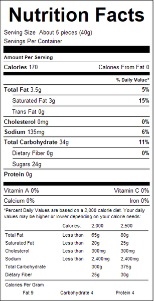 "ingredients": "Sugar, Corn Syrup, Coconut Oil, Maple Syrup, Salt, Cotton Stearine, Natural Flavors, Soy Lecithin, Mono & Diglycerides, Color.<br />**Contains: Soy Ingredients.<br /><br /><br /><br />Made with Bioengineered Ingredient(s).",