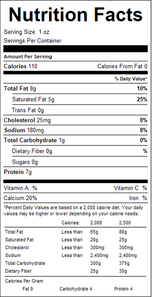 "ingredients": "Pasteurized Milk, Salt, Enzymes, Cheese Cultures, Annatto Coloring",