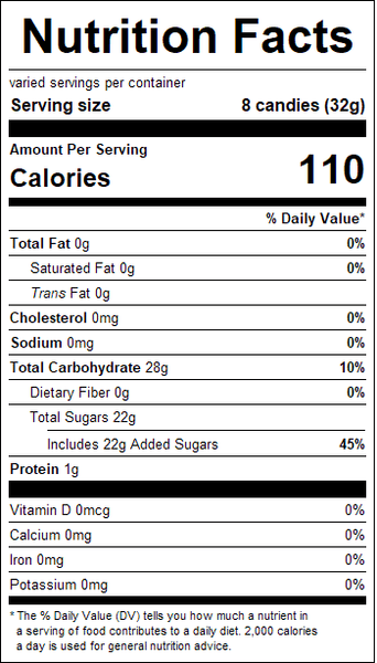"ingredients": "Sugar, Corn Syrup, Glycerin, Gelatin, Natural and Artificial Flavor, Coor (FD&C red #3, red #40 lake).Manufactured in a peanut free facility.<br /><br />Made with Bioengineered Ingredient(s).",