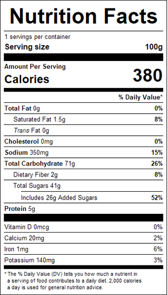 "ingredients": "Corn Syrup, Sugar, Peanuts, Sodium Bicarbonate, Salt.Contains Peanuts.Manufactured on shared equipment and may contain traces of soy, milk, peanuts and other tree nuts.",