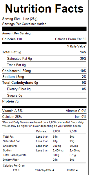 "ingredients": "Pasteurized Grade A Milk, Cheese, Culture, Salt and Enzymes. <br /><br />Contains: Milk",