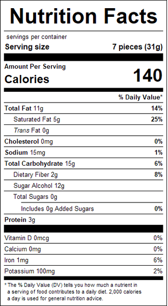"ingredients": "Chocolate Coating (Maltitol, Chocolate Liquor, Cocoa Butter, Sodium Caseinate, Butterfat, Soy Lecithin [An Emulsifier], Artificial Vanilla Flavor, Natural Vanilla Flavor, Salt, Sucralose), Almonds, Water, Gum Arabic, Modified Starch (Tapioca), Confectioners Glaze, Coconut Oil, Canola Oil.Contains: Milk, Soy, And Tree Nuts (Almonds).Manufactured In A Plant That Processes Peanuts, Tree Nuts, Soy, Wheat (Gluten), Eggs, And Dairy Products.Consumer Warning This Is Not A Low Calorie Food. Products Labeled As No Added Sugar Is Not Reference To The Naturally Occurring Sugars Within The Fruit Or Nut Center; The Coatings And Sweeteners Are Sugar Free.. Excessive Consumption May Have A Laxative Effect.",
