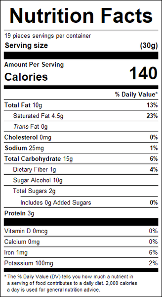 "ingredients": "Chocolate Coating (Maltitol, Chocolate Liquor, Cocoa Butter, Sodium Caseinate, Butterfat, Soy Lecithin [An Emulsifier], Artificial Vanilla Flavor, Natural Vanilla Flavor, Salt, Sucralose), Peanuts, Raisins (Raisins, Sunflower Oil), Almonds, Pecans (Pecans, Soybean Oil), Water, Gum Arabic, Confectioners Glaze, Modified Starch (Tapioca), Vegetable Oil (Coconut Oil, Canola Oil).<br /><br />Contains Milk, Peanuts, Soy, Tree Nuts (Almonds, Pecans).<br /><br />Manufactured In A Plant That Processes Peanuts, Tree Nuts, Soy, Wheat (Gluten), Eggs And Dairy Products.",