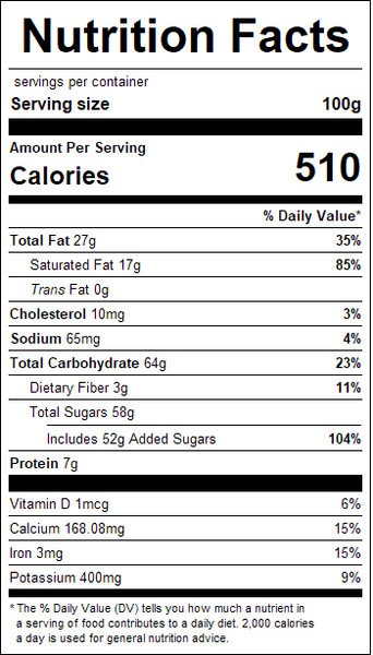 "ingredients": "Sugar, Unsweetened Chocolate, Dry Whole Milk, Cocoa Butter, Nonfat Dry Milk, Soy Lecithin (an emulsifier), Vanilla Extract.",